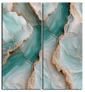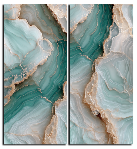 A diptych artwork that evokes the serenity of the deep sea and the opulence of the earth. "Calcite Currents" captures the fluid movement of opal, turquoise, and emerald veins. The soft green layers blend with creamy white waves and are dramatically accented by fine golden veins that add a touch of sophisticated glamour.