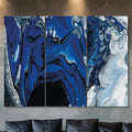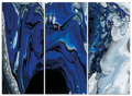 A triptych artwork that evokes the mystery and immensity of the ocean depths. "Cobalt Vortex" uses the fluid art technique to create a turbulent drama in shades of royal blue, cobalt blue, deep black, and silver-grey. The composition generates the illusion of marine whirlpools, mineral sediments, and rich textures.