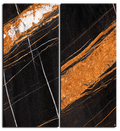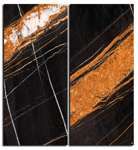 A diptych artwork that radiates opulence and mystery. "Dark Geode" captures the majesty of dark marble, featuring blocks of deep black and slate gray. The composition is dramatically crossed by brilliant golden veins and terracotta tones, simulating a geological break infused with precious metal.