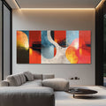 An abstract artwork that explodes with energy and emotion. "Diffuse Boundary" boldly juxtaposes blocks of deep reds and burning oranges with soft curves of distressed blue and gray. The design creates a sense of dynamic movement and depth, emphasized by subtle lines suggesting perspective or speed.