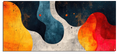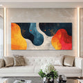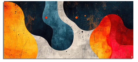 An abstract artwork that evokes nature and emotion in their purest state. "Earthly Pulsations" features fluid shapes interwoven in warm yellow, deep blue, and fiery red tones, all accented with rough textures and subtle specks. The horizontal composition invites the eye to travel through the curves and contrasts.