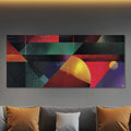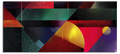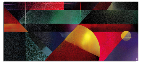 An abstract artwork that balances the chaos of texture with the precision of form. "Hue Fusion" uses blocks of saturated color (red, green, yellow, blue) and fragments them with a fine dot texture, creating an atmosphere of digital particles or cosmic sand.
