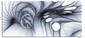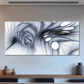 An abstract artwork that explores the beauty of form and movement. "Pearlescent Spaces" uses fluid, fractal lines to create a sense of depth and spiral, accented by strong negative spaces that seem to float. The white, black, and gray palette creates an ethereal and sophisticated atmosphere.