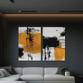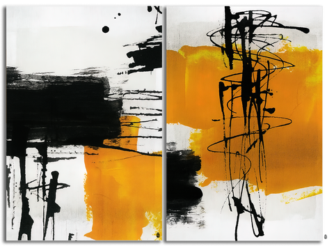 A powerful explosion of emotion across two canvases. Uses the intensity of ochre yellow as a backdrop for bold black gestures. The artwork contrasts color blocks with fine, energetic lines, creating a sense of spontaneous writing and raw action. This diptych is an injection of vitality and expressive boldness.