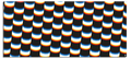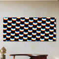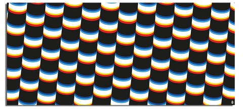 An optical art piece that mesmerizes with its repetition. "Tricolor Wave" uses concentric stripe patterns in white, blue, red, and yellow on a dark background to create a three-dimensional illusion of cylinders or curves.