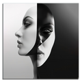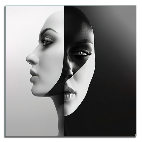 Two faces, one body—Split Presence captures the paradox of simultaneous perspectives. The profile looks outward, detached, almost sculptural, while the frontal gaze pierces through the viewer with quiet intensity. This dual configuration suggests a self that is both exposed and concealed, both subject and observer.