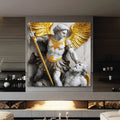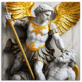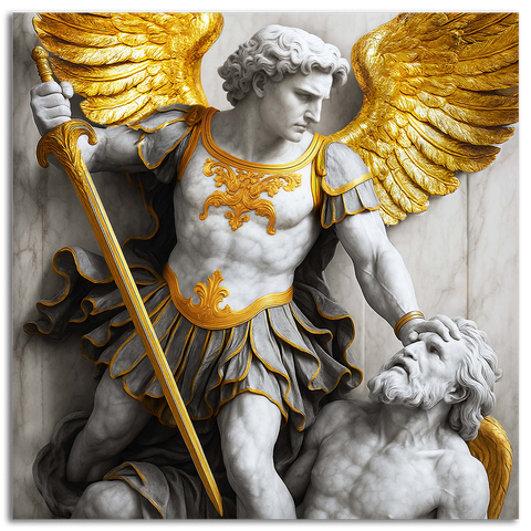 Capture the essence of unwavering triumph. "In Nomine Fidei" is a monumental depiction of the Archangel Michael, the Warrior of God, executed in marble with spectacular gold details. The piece is not only art; it is a statement of power and conviction. Witness the Archangel's relentless strength as he subdues the Adversary, symbolizing the inevitable victory of faith over all shadows.