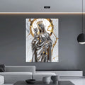 This artwork immortalizes the Virgin Mary and the Child Jesus in a stunning polished metal sculpture, symbolizing purity and divinity. The majestic white marble background, gleaming with gold veins, frames the Mother figure, crowned with stars and enveloped in a halo of light.