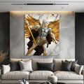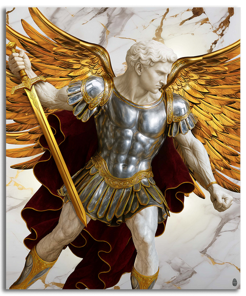 This artwork captures Archangel Saint Michael in a dynamic action pose, wielding his golden sword with unwavering purpose. The sculpture combines cool marble, bringing his body to life, with the fiery sheen of silver armor and commanding gold wings. The vibrant red cloak adds an epic drama.