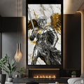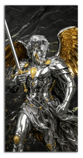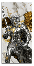 An exploration of how celestial metals unite to create a divine warrior, combining the earthly strength of the sword with the lightness of the wings. The combat stance adds a strong sense of frozen movement and tension. The shine of the armor is the main focus. A sculptural and technical luxury acquisition, ideal for high-definition and refined industrial style interiors.