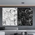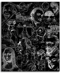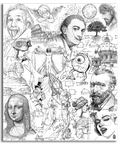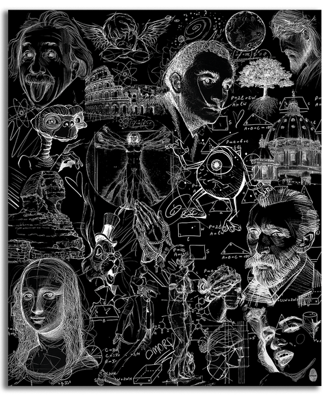 A masterpiece of complexity within simplicity. "The Universe's Blackboard" is an intricate deep dive into culture, science, and history, presented in a rigorous black and white that defines the minimalist style. Portraits of geniuses, mathematical formulas, and iconic references are layered in a vibrant sketch composition.