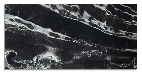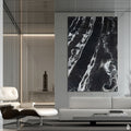 The dense, dark richness of obsidian, sculpted into large undulating formations by the light. The black areas have a velvet depth that contrasts with the almost white reflection on the curves. The composition is dynamic with a serpentine movement. It is a dramatic, mineral luxury, evoking the dark, polished geology of volcanic stones.