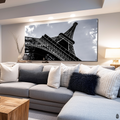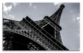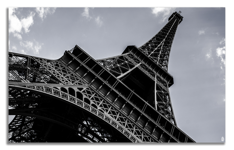 An artwork that captures the engineering and majesty of a global icon. "The Iron Lady" is a black and white photograph of the Eiffel Tower, captured from a dramatic low angle that emphasizes its scale and geometric complexity. The iron beams are projected dramatically against the bright sky, utilizing shadows and high contrast to highlight the intricate structure.