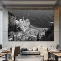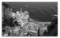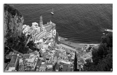 An artwork that captures the dramatic beauty of a historic coastal landscape. Is a large-format black and white photograph showing a Mediterranean village descending a rocky hillside to the sea. The high contrast emphasizes the geometric forms of the white houses and the rough texture of the cliff, contrasting with the textured surface of the sea.
