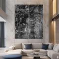 The Latin name for gold (Aurum), used to describe the lines that define the form and structure of the piece. The deep black lines are complemented by the sheen of the gold, achieving a rich three-dimensionality. The uniform lighting highlights the quality of the texture and veining. A material and contrast luxury acquisition that offers visual solidity to any wall.