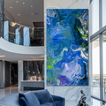 An abstract interpretation of the slow, powerful movement of ice and frigid water. White and light blue tones dominate, evoking the sheen of a glacier breaking and moving. The fluid lines suggest the passage of time and the force of nature. A serene, icy luxury work that provides a sense of freshness, cleanliness, and majesty.