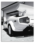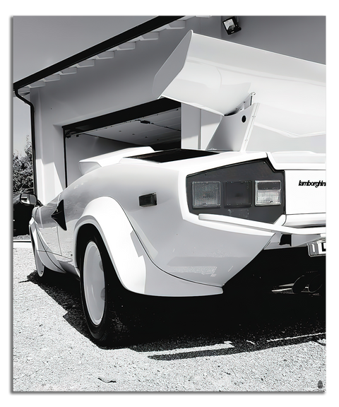 An artwork that encapsulates the radical futurism and aggression of late 20th-century Italian design. "Countach Profile" is a black and white photograph focusing on the iconic rear end of the Lamborghini Countach. The monochrome palette accentuates the dramatic wedge-shaped lines, the imposing spoiler, and the wide wheel arches that define the supercar aesthetic.