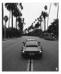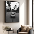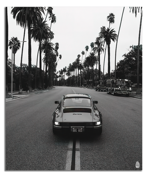 An artwork that merges timeless design with West Coast glamour. "The California Line" is a square, centered photograph capturing the iconic rear end of a Porsche 911, cruising down a monumental palm-lined avenue. The use of black and white intensifies the contrast, giving the scene a feeling of cinematic nostalgia and quiet luxury