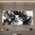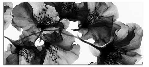 An abstract artwork that explores the intensity of pure contrast. "The Kinetic Effect" uses a base of parallel black and white stripes, overlaid with an intricate composition of triangles and blocks. The design generates a powerful illusion of depth, creating the sensation of a broken blind or a moving pixel matrix.