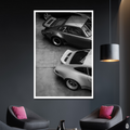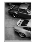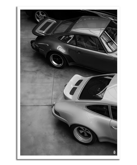 An artwork that celebrates the legacy and timeless form of the Porsche 911 through a visual contrast. Is a vertical, monochrome aerial photograph capturing two iconic 911 Turbos. The top-down perspective emphasizes the unmistakable "whale tail" silhouette and the body's width against the clean lines of the floor.