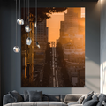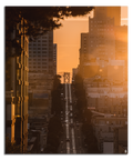An artwork that captures the magic and drama of the urban landscape through light. Is a vertically composed photograph featuring a steep city street, with the skyline and a bridge in the background. The scene is flooded with a warm, fiery glow, creating a sharp contrast between the dark silhouettes of the side buildings and the radiant sky.
