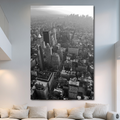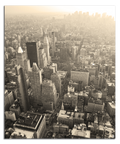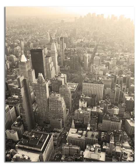 An artwork that offers a majestic and nostalgic perspective of the city that never sleeps. Is an aerial photograph that captures the vastness of the New York skyscrapers, bathed in a warm sepia light that evokes a sense of timelessness.