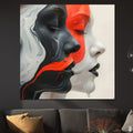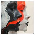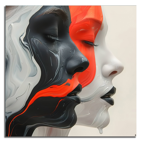 A crimson current flows between two faces—one dark, one light—each sculpted in liquid emotion. The black and white forms seem to drift toward each other, not in conflict, but in quiet surrender. The red streak acts as a bridge, a pulse, a shared breath between opposites. With closed eyes and melting contours, the figures evoke serenity, transformation, and unity.