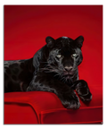 The panther reclines with the confidence of a fashion icon. The intense black of its coat over the carmine red creates an atmosphere of mystery and desire. A piece that radiates luxury, magnetism, and a totally chic and contemporary attitude.