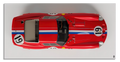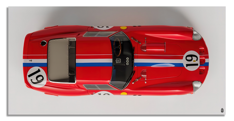 "Red Racer" offers a dramatic, graphic zenith view (from above) of an iconic Italian racing prototype. The perspective highlights the aerodynamic lines, the open cockpit, and the competition markings (the number 19 and the blue/red stripes).
