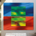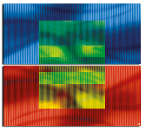 A masterful piece of Op-Art that challenges perception. "The Inverted Plane" uses parallel black and white lines to create a complex hexagonal net, where two isometric cubes seem to float or embed themselves in the surface. The precision of the pattern generates a surprising three-dimensional effect and constant visual movement.