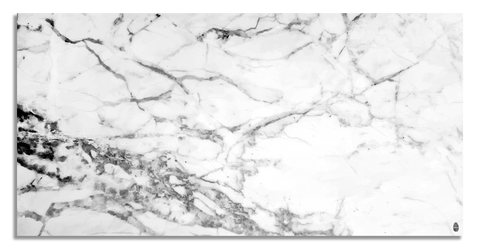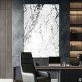 Las líneas blancas simulan ríos helados o hielo agrietado sobre una superficie rocosa oscura. El blanco puro contrasta con los tonos gris humo en las zonas de transición. La organización panorámica y expansiva confiere al diseño una sensación de escala épica. Un lujo frío y escultórico, perfecto para interiores que buscan un equilibrio entre calidez y sofisticación monocromática.