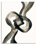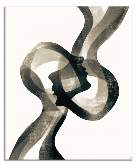 A minimalist artwork that captures the essence of human interaction and movement. "Silhouettes in Sepia" uses abstract, fluid, and overlapping lines in black and sepia tones to represent two profile silhouettes. The design generates a sense of continuous flow and an intimate, dramatic dialogue.