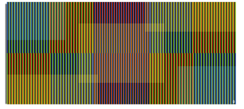 Una obra cautivadora que desafía la percepción. «Vibrant Spectrum» utiliza líneas verticales superpuestas en un patrón de Op-Art para crear una riqueza de color y movimiento visual. El diseño, aunque esencialmente lineal, palpita con tonalidades de azul, rojo, amarillo y naranja, revelando formas sutiles a medida que interactúa la luz.