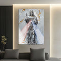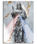 This artwork presents Christ in a stunning sculpture of polished metal (chrome/silver), powerfully contrasted against the white marble background elegantly fractured with gold (Kintsugi technique). Jesus's blessing posture and the figure's reflected shine radiate a serene and timeless authority.